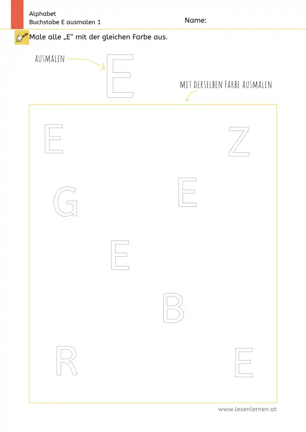 Arbeitsblatt zum Ausmalen und Erkennen des Großbuchstabens E