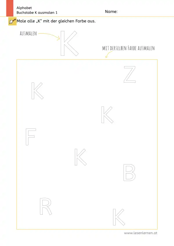 Arbeitsblatt zum Ausmalen und Erkennen des Großbuchstabens K