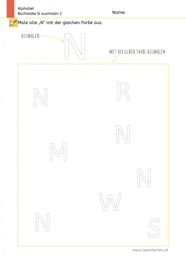 Arbeitsblatt zum Ausmalen und Erkennen des Großbuchstabens N