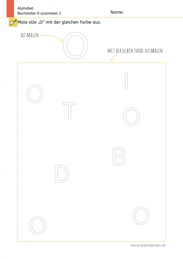 Arbeitsblatt zum Ausmalen und Erkennen des Großbuchstabens O