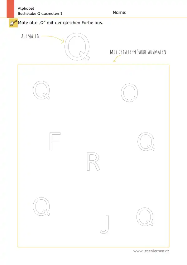 Arbeitsblatt zum Ausmalen und Erkennen des Großbuchstabens Q