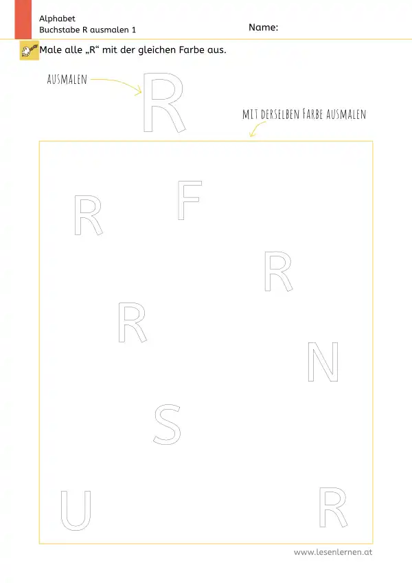Arbeitsblatt zum Ausmalen und Erkennen des Großbuchstabens R