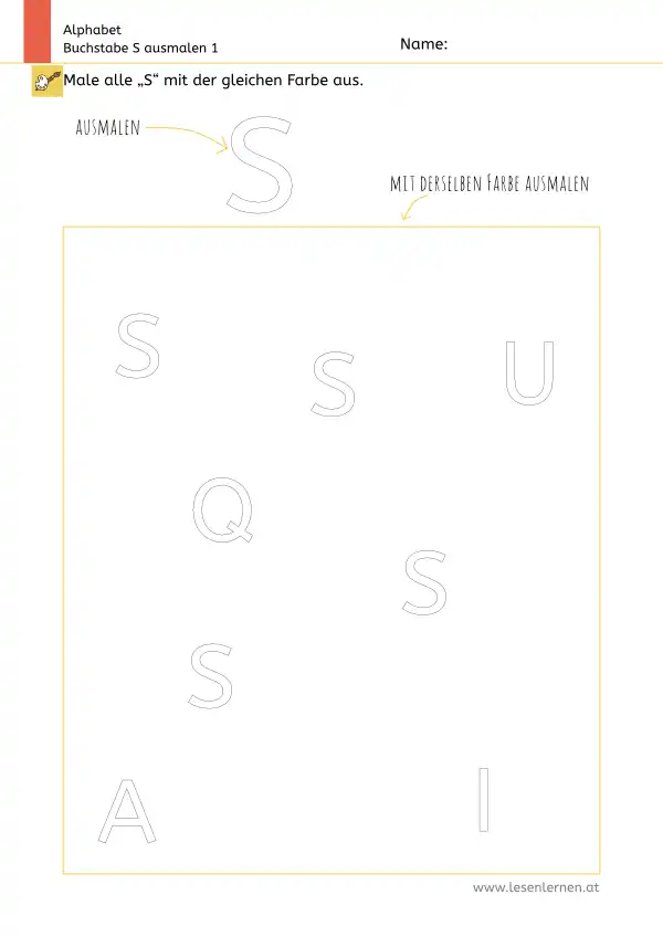 Arbeitsblatt zum Ausmalen und Erkennen des Großbuchstabens S