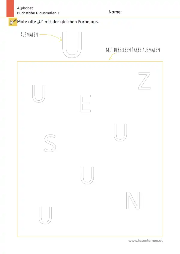 Arbeitsblatt zum Ausmalen und Erkennen des Großbuchstabens U