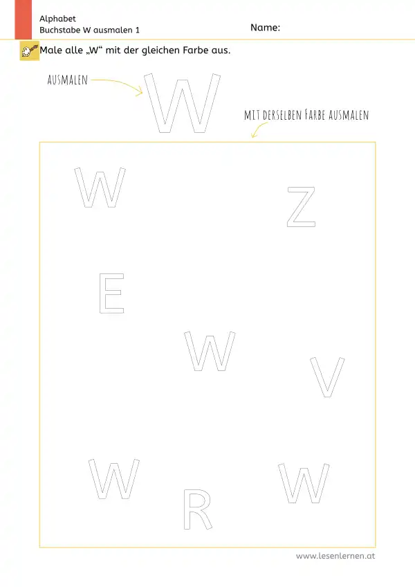 Arbeitsblatt zum Ausmalen und Erkennen des Großbuchstabens W