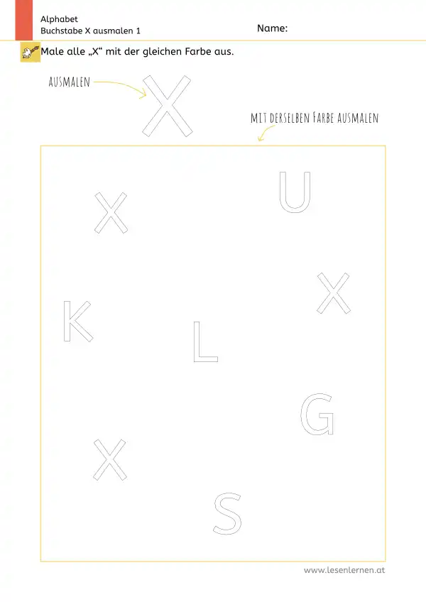 Arbeitsblatt zum Ausmalen und Erkennen des Großbuchstabens X