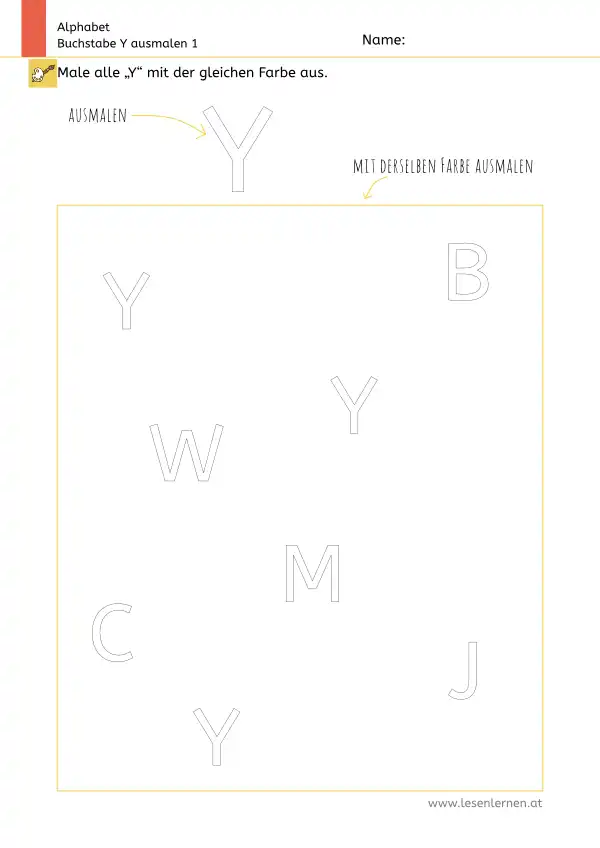 Arbeitsblatt zum Ausmalen und Erkennen des Großbuchstabens Y