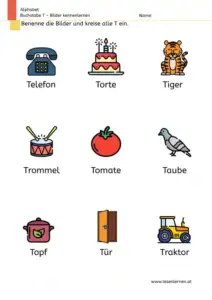 Bei der Übung sind einige Bilder um den Buchstaben T angeordnet. Das Kind soll nun jene Bilder auswählen, das mit dem Laut T beginnt.