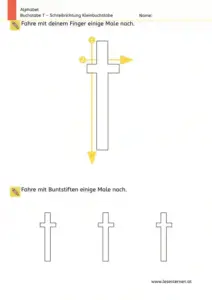 Erst wenn Kinder die korrekte Schreibrichtung der Buchstaben beherrschen, ist ein Nachspuren sinnvoll. Größere Buchstaben helfen anfangs. Als Anleitung kann ein Bild mit korrekter Schreibrichtung des Buchstabens zum Üben beigelegt werden.