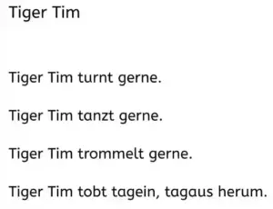 Eine ähnliche Übung ist das Bilden von Sätzen, in dem alle Wörter den gleichen Anfangsbuchstaben haben: Tiger Tim turnt tagsüber.