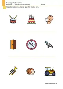 Das Kind soll aus jeweils drei Bildern erkennen, welche zwei Wörter mit dem gleichen Anlaut beginnen. Wichtig ist es, dass dem Kind die Bilder bekannt sind und es ist anfangs sinnvoll, die Aufgabe gemeinsam mit dem Kind durchzuführen. So kannst du mit dem Finger auf die Bilder zeigen, die Worte vorsagen und die gesuchten Laute betonen.