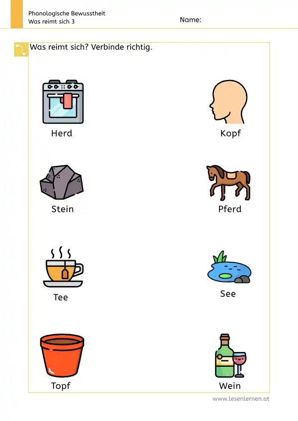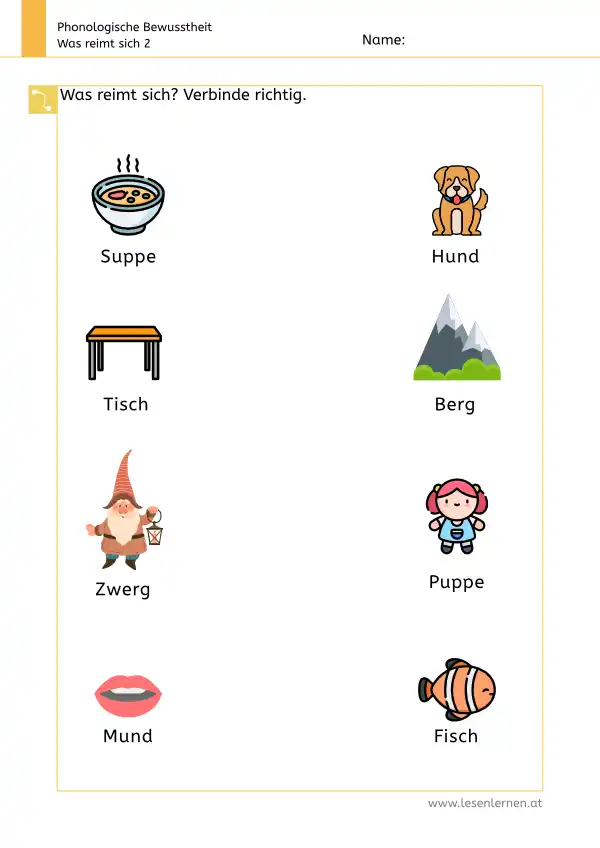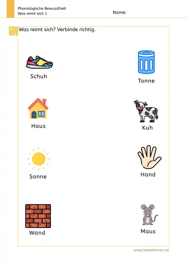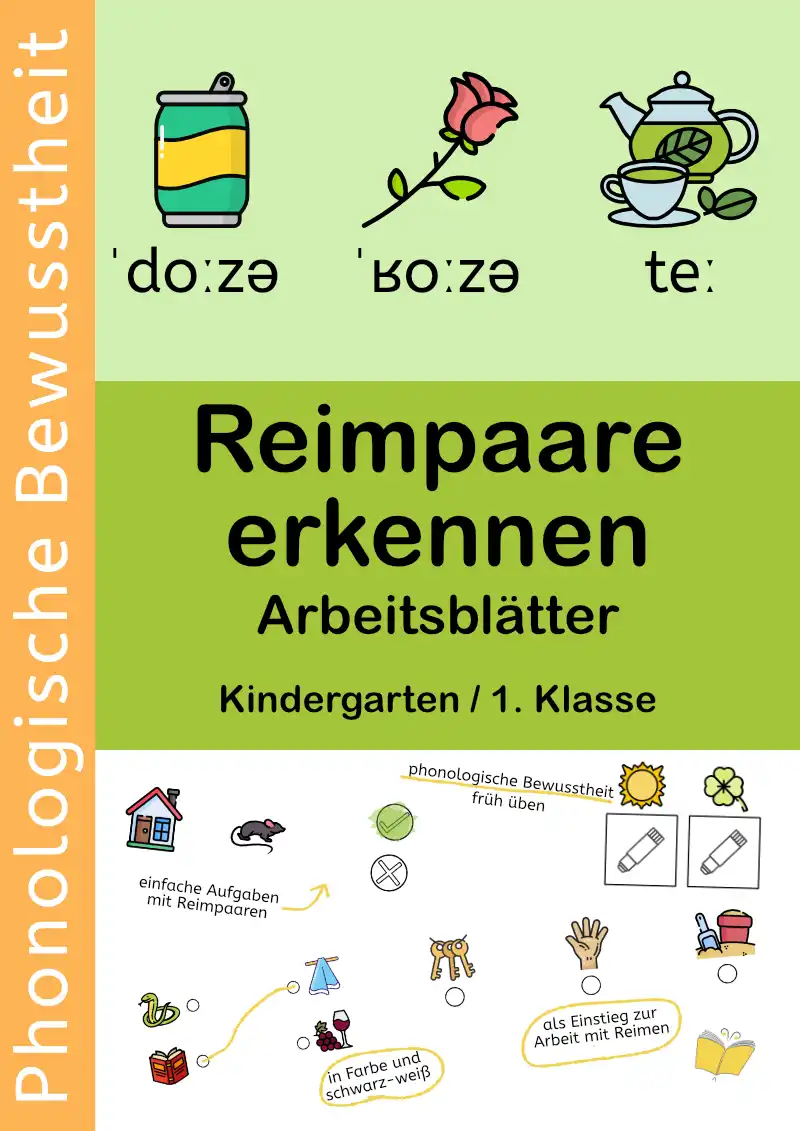 Reime sind der perfekte Einstieg in die phonologische Bewusstheit. Mit diesen Arbeitsblättern lernen Kinder, einfache Reime zu erkennen.