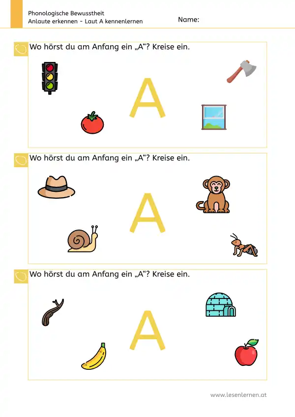 Arbeitsblätter zum Kennenlernen der Anlaute.