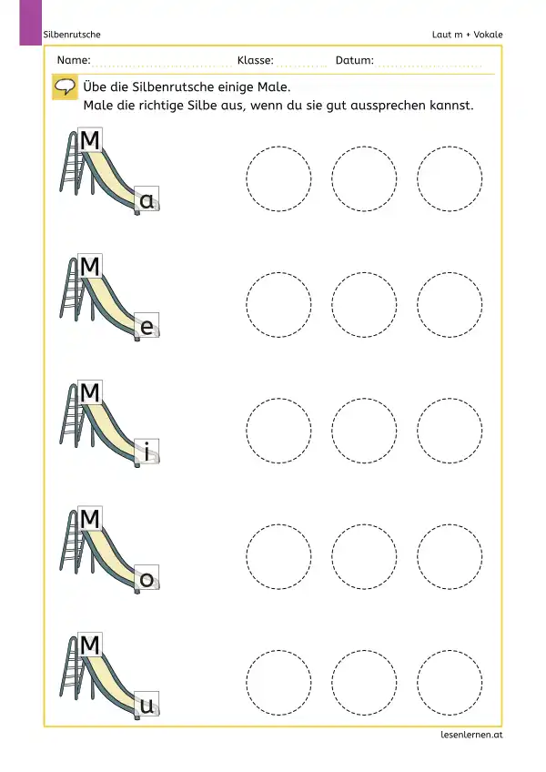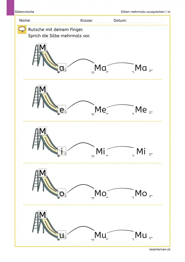 Die Arbeitsblätter sind bewusst kurz und klar aufgebaut: Finger rutschen lassen, die Silbe laut sprechen, mehrmals wiederholen und (je nach Blatt) aufschreiben. Die Vorlagen kannst du immer wieder neu beschriften und für weitere Buchstaben nutzen.